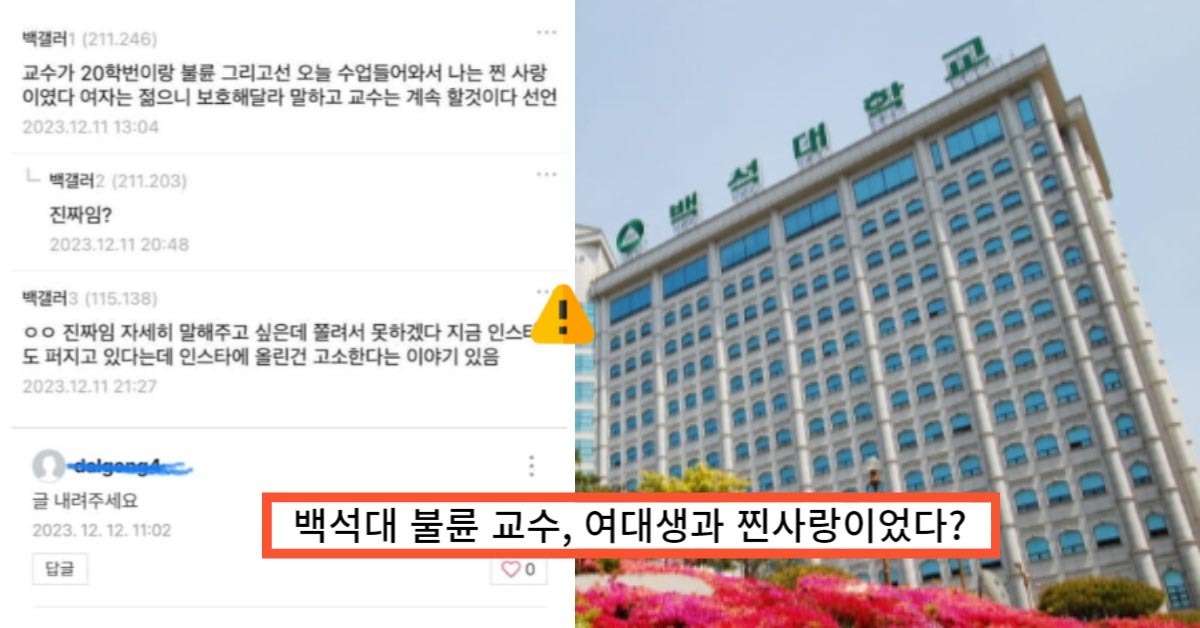 충남지역 백석 대학교에서 유부남 교수와 여학생 간의 불륜 사건이 파문을 일으킨 가운데 이들 남녀의 대화 내용이 추가로 더 알려졌습니다.