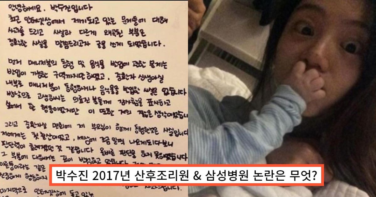 박수진은 남편 외에는 면회가 불가한 산후조리원에 입원한 친구를 방문하고 자신의 SNS에 사진과 글까지 올려 논란이 됩니다. 면회를 허락한 산후조리원과 박수진 모두 비난을 받게 됩니다.